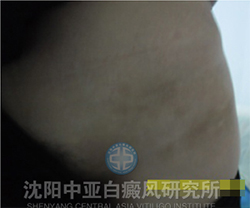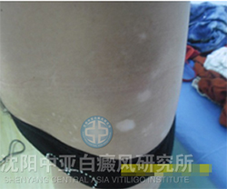 2、Wood检查:左侧髂部,腹股沟显性色素脱失100%,伴有隐性色素脱失,边缘模糊不清。