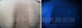 【治疗前,Wood灯下见前背部出现片状白斑,边缘模糊不清,色素脱失严重。】
