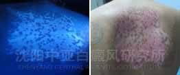 4、Wood灯:灯下见前背部出现片状白斑,边缘模糊不清,色素脱失严重。