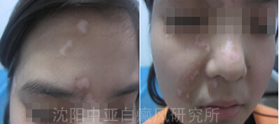 1、光疗:采用美国第二代308nm准分子光疗法进行治疗,3个疗程;白斑达到稳定期后,使用黑色素细胞培植术使病情达到彻底治疗。