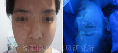 1、wood灯:面部白斑色素脱失大约80%,额头部位色素脱失60%