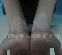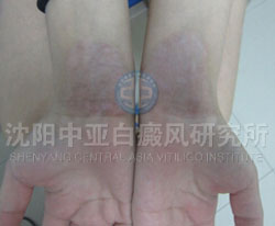 患者自幼记得足踝部有一硬币状白斑,八年前腰骶部出现白斑,始于点状,逐渐扩大,而今已发展至双手,髋部等,多方多处治疗,病情反复,最终无果。去年夏季,病情再次发展,于是采用偏方,导致病情扩散。在经人介绍的情况下来到我院进行治疗。我院的权威医生马萍主任在治疗前对她进行了一系列的检测,最终制定治疗方案,先采用308nm准分子光进行治疗,稳定病情,随后采取黑色素细胞培植术进行彻底治愈。>>>>免费咨询在线医生,白癜风会遗传吗?