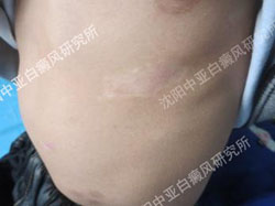 患者上身肋部和胸部患有白斑两年,曾在当地诊所治疗,使用外用药擦拭,使患处产生了抗药性。因为白斑有扩散现象,现来我院治疗。经过检查后,根据检查结果和患者谭家勇的身体状况,我们采用了药离子渗透疗法和黑色素细胞培植术综合治疗,并对患者微小白斑使用美国第二代308nm准分子光治疗法,促进白斑恢复。由于患者平时喜欢吃零食,且有很多不良生活习惯,我院在治疗期间也通过开食谱对患者进行食疗。建议患者康复后,家长要督促孩子保持良好的生活习惯,做好皮肤保护,防止暴晒。另外,多吃一些外观色泽为黑色、紫色的食品以及带壳类食品,少吃富含维生素C的食品,防止复发。医院地址:沈阳市皇姑区北陵大街6号(省公安厅往南走200米),热线电话:400-6060-981。