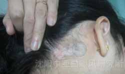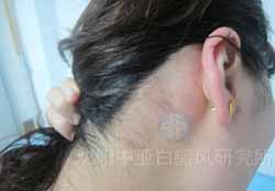 张凤(化名),女,20岁,家住吉林,在沈阳上学。一年前发现后颈部有白斑出现,鉴于白斑当时只有指甲盖般大小,加上不明显不在暴露部位,就没怎么在意。谁知白斑居然会随着岁月的积累而扩散,现如今昔日的指甲盖般大小白斑已扩散到鸡蛋般大小了。