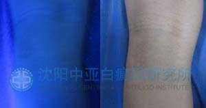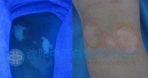 【患者来院治疗时,腿部白斑照片,左图为WOOD灯下白斑图片】