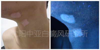4、wood灯:颈部均有不同程度脱失性白斑。