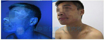 病史:患者诉2年前发现面部白斑,曾在北京、上海华山医院检查治疗, 外用用药大量药物,治疗效果不佳,于今日来院就诊。