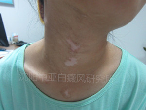 ▲病 史:脖颈部发现白斑半年多,在区医院治疗采用外擦药治疗(药名不详),今来我院治疗。